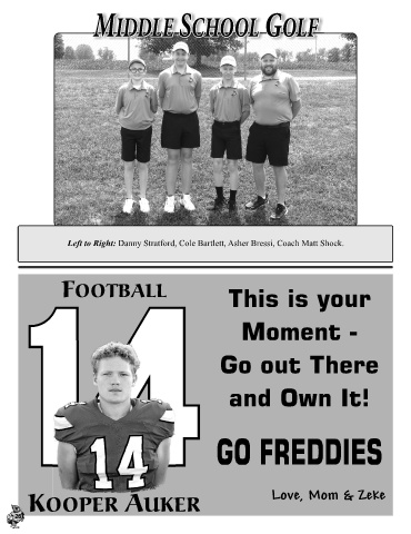 M M MIDDLE SCHOOL GOLFIDDLE SCHOOL GOLFIDDLE SCHOOL GOLF Left to Right: Danny Stratford, Cole Bartlett, Asher Bressi, Coach Matt Shock. FOOTBALL This is your Moment - Go out There and Own It! 141414 GO FREDDIES Love, Mom & Zeke KOOPER AUKER 26 26 26